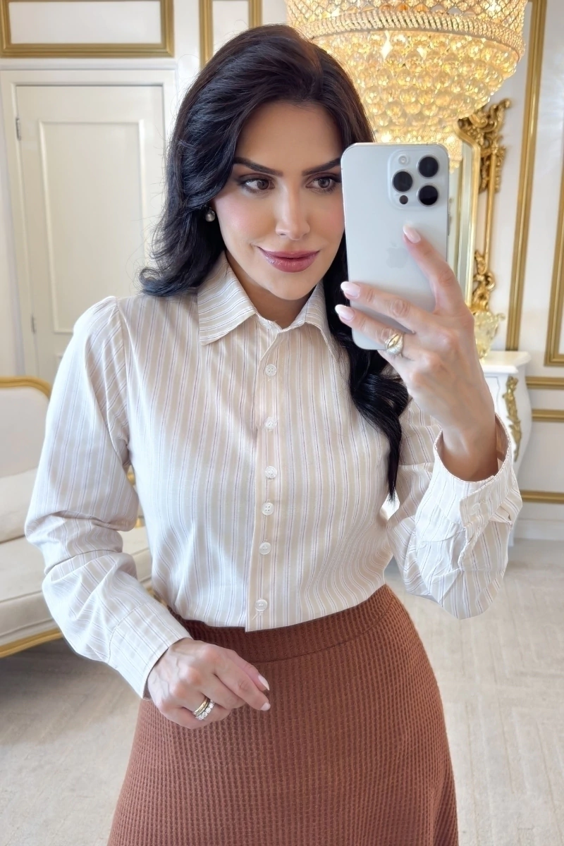 Descrição:Elegância e sofisticação definem essa camisa! Com um tecido leve e de toque macio, ela traz listras sutis que adicionam um charme atemporal ao look. O caimento impecável proporciona conforto sem perder a classe, perfeita para composições versáteis – do trabalho a um encontro especial. Combine com saias, calças de alfaiataria ou até mesmo jeans para um visual moderno e refinado! ✨