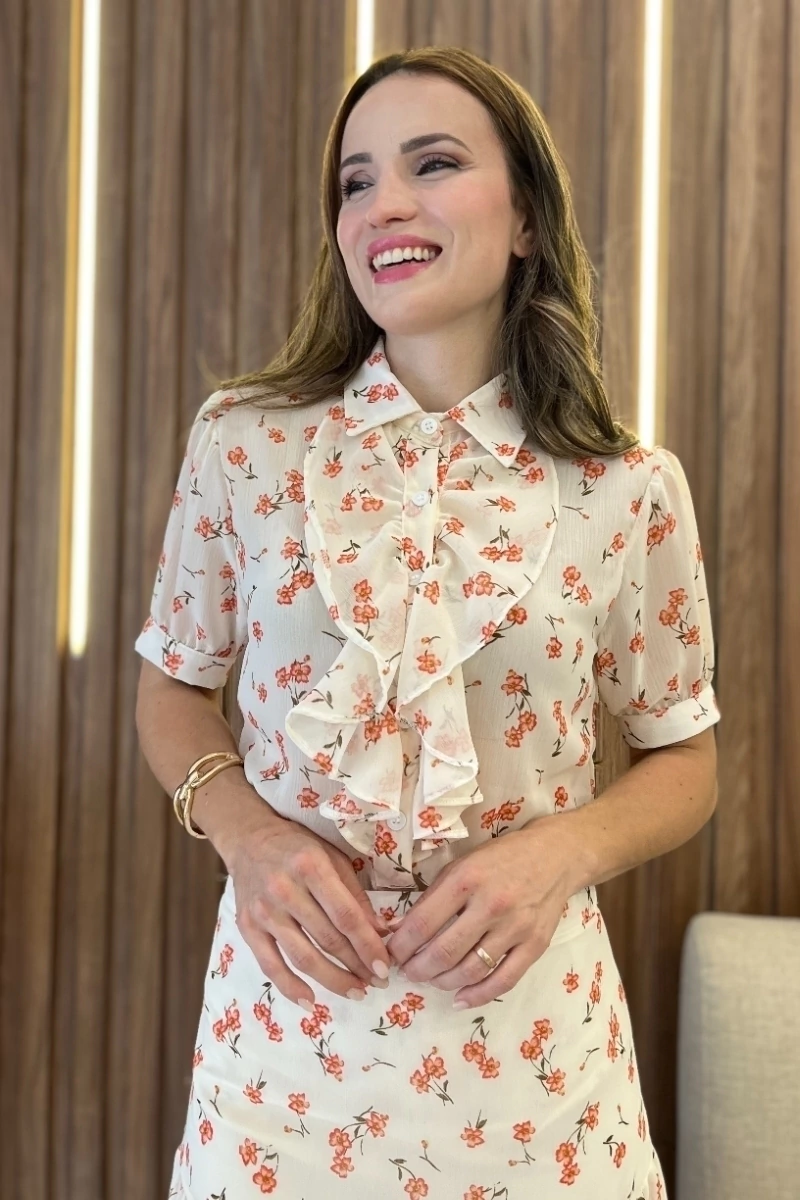 Descrição: A combinação da blusa e saia Celina resulta em um visual harmonioso, elegante e cheio de movimento. O floral em tons suaves e o crepe fluido valorizam a silhueta com naturalidade, criando uma proposta versátil que transita do casual chic ao sofisticado com facilidade. Um look encantador, que traduz toda a essência da mulher Lu Bella.