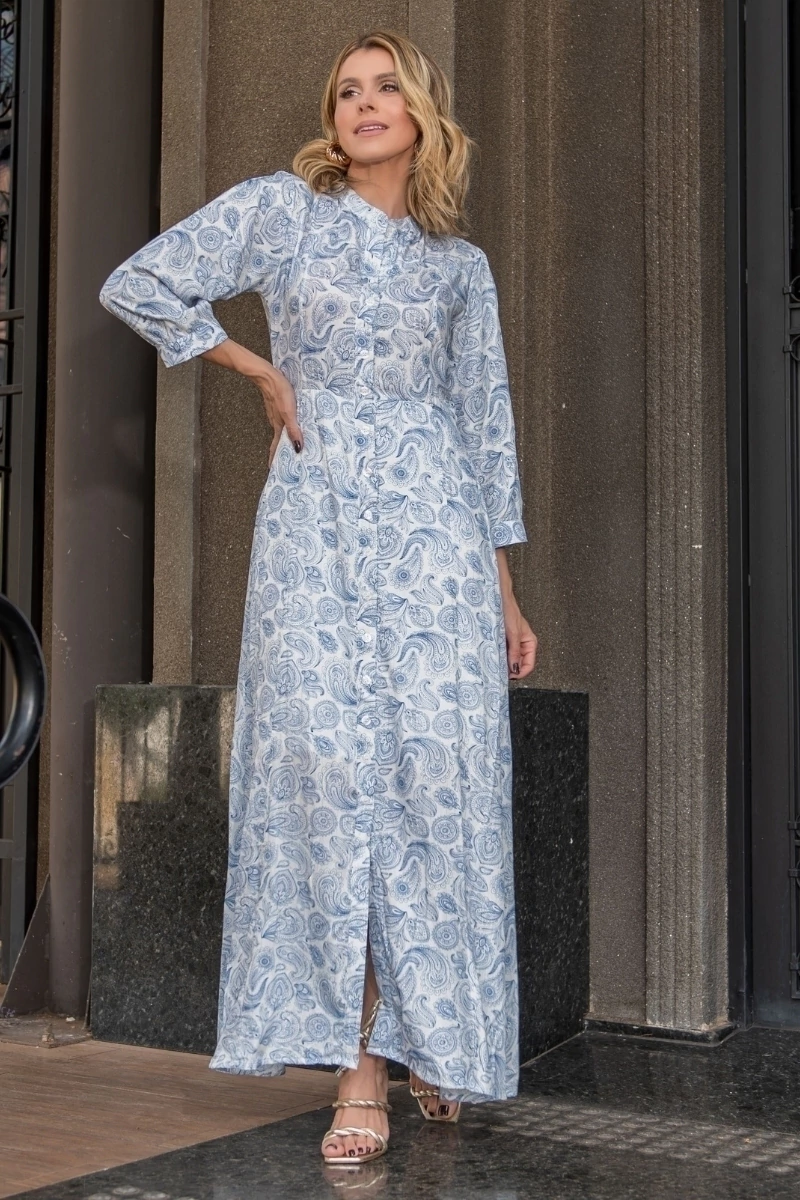Descrição: O vestido Camille é a definição de elegância atemporal. Com fechamento frontal todo em botões delicados, ele encanta à primeira vista com sua estampa cachimire sofisticada, que imprime charme e personalidade. A manga 7/8 traz um toque clássico, enquanto o comprimento max midi alonga a silhueta com graça. A saia leve e fluida confere movimento e feminilidade em cada passo, criando um visual naturalmente encantador. É aquela peça indispensável no guarda-roupa de toda mulher elegante — perfeita para quem valoriza estilo com leveza e sofisticação.