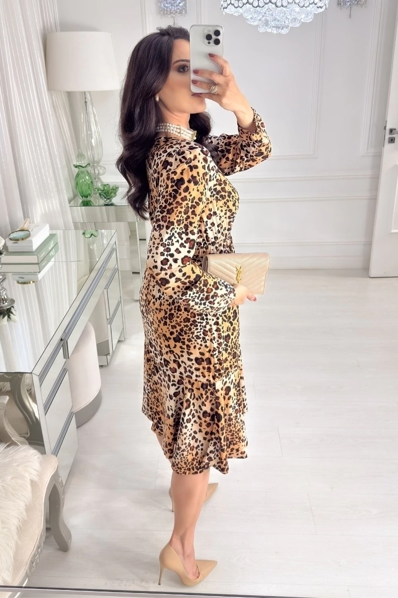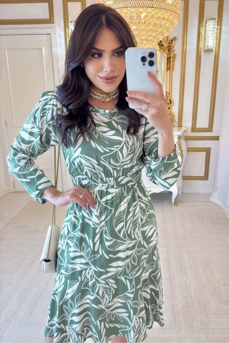 A estampa do Vestido Stela é um dos seus maiores encantos: com fundo escuro e elementos modernos, ela traz um equilíbrio perfeito entre sofisticação e versatilidade. Atemporal, combina facilmente com diferentes estilos e ocasiões, permitindo composições elegantes ou despojadas